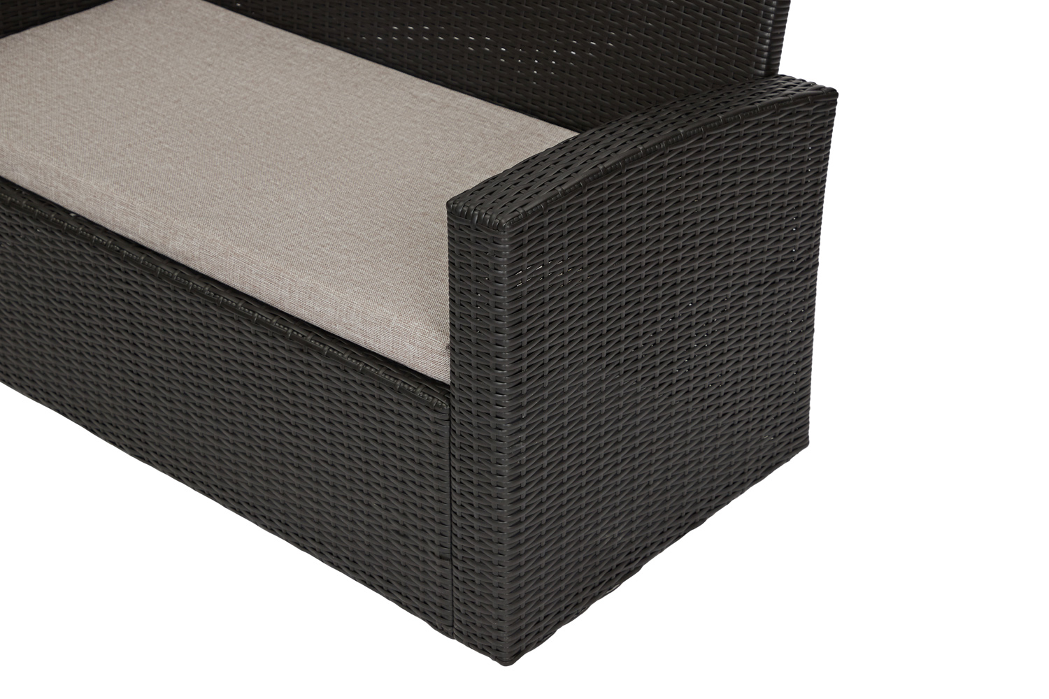 Плотная сетка из искусственного ротанга коричневого цвета является спинками и стенками кресел и дивана, а также обрамляет боковые стороны журнального столика. Во всех изделия каркас состоит из стали. Рабочая поверхность столика (столешница) состоит из закаленного стекла, который выдерживает до 25 кг веса (отлично подойдет для того, чтобы разместить шашлыки и охлажденные напитки во время дружеских встреч на природе). Размеры дивана – 124х78х58 см, кресла (в наборе 2 штуки) – 67х78х58 см, стола – 104х39х51см.