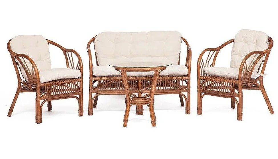 Это подушки, предназначенные для комплекта мебели New bogota для сада, в комплекте находятся подушки для дивана, а также двух кресел, спинка и сидение являются отдельными элементами. Для изготовления данного комплекта могут быть использованы мебельные ткани, имеющие разную фактуру и цвета. Благодаря завязкам подушки надёжно прикрепляются к мебели. В качестве наполнителя применяется поролоновая крошка, а подушки простёганы пуговицами. Вес данной подушки составляет 7 кг, объём 0,20 м³