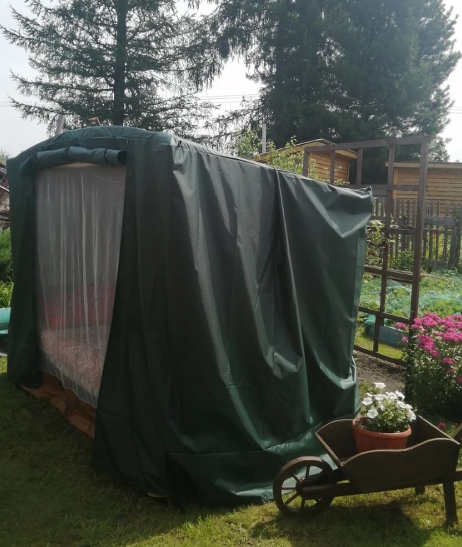 Чехол надежно крепится к каркасу с помощью прочных завязок с фастексами и лент с полукольцами, что предотвращает сдувание чехла ветром.
