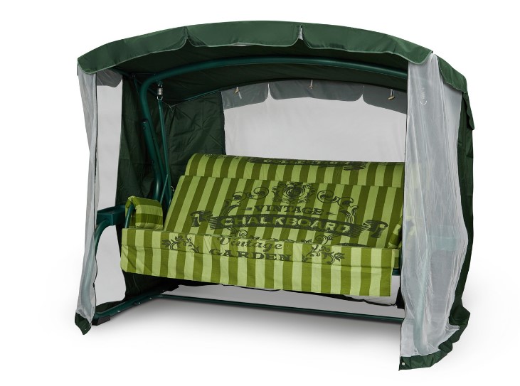 Данный тент предназначен для садовых качелей, размер которых имеет размер 225 см х 123 см, у данного тента приятный зелёный цвет. Изготовлен он из полиэфирного волокна. Такой тент может отлично защитить вас от прямых солнечных лучей и осадков, благодаря такому тенту ваш отдых станет более комфортным.